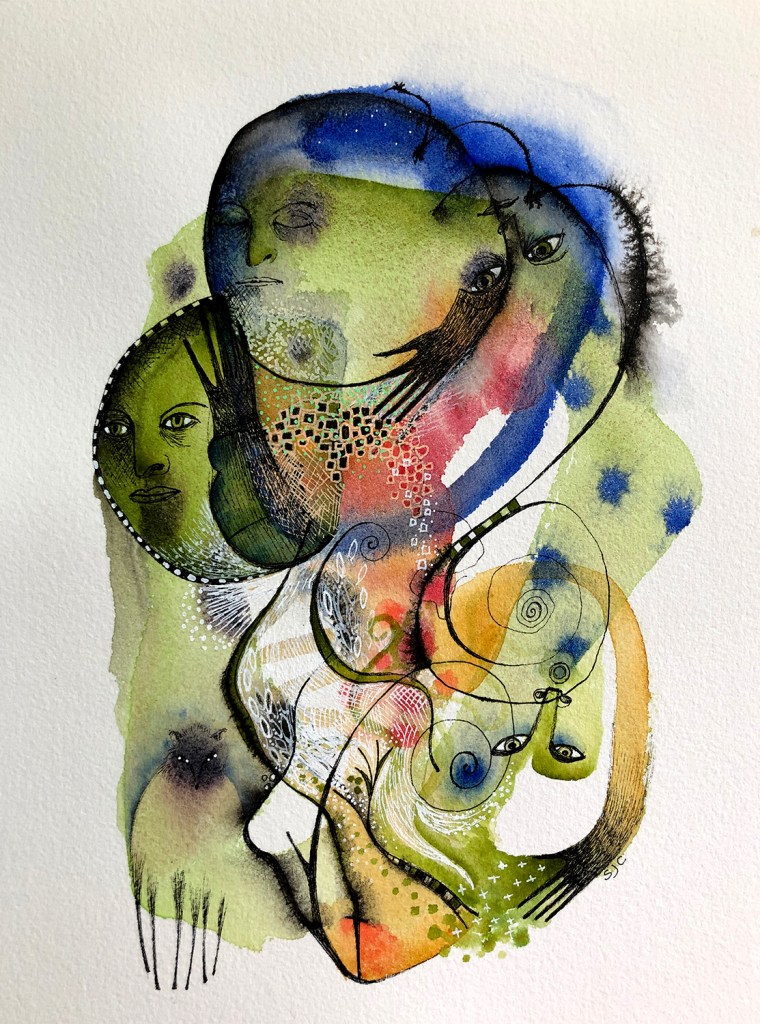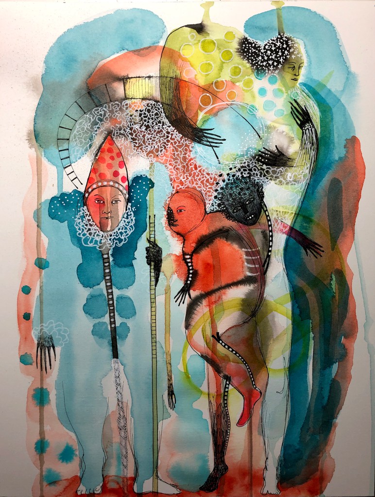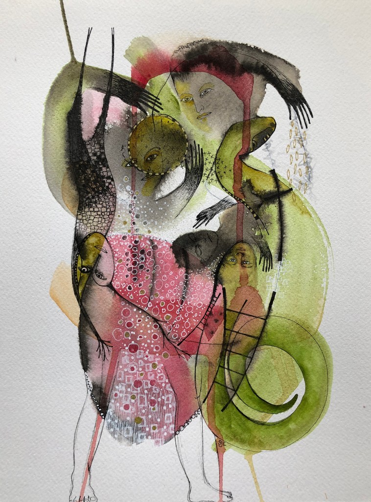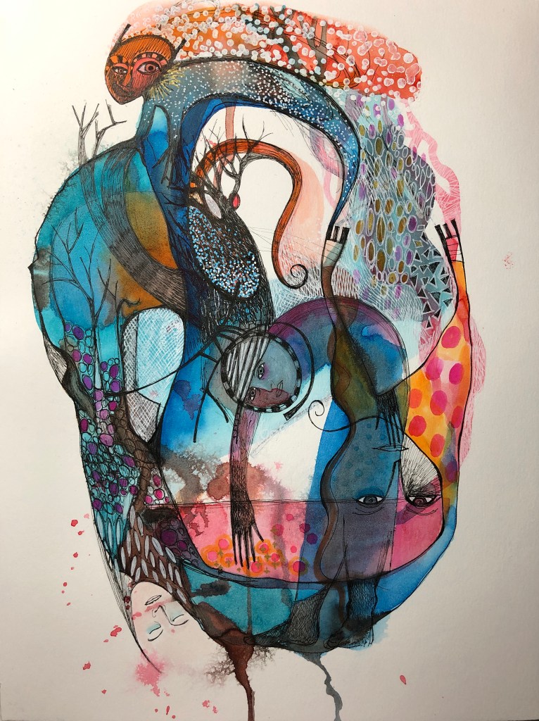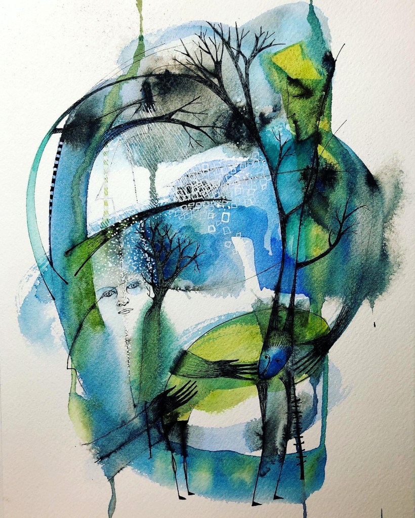 ‘Fishing for Memory’, watercolor, ink, acrylic on paper, 12 x 9 inches, $300 plus shipping